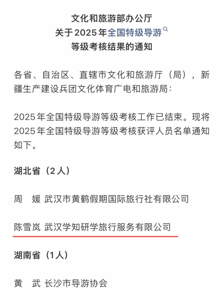至此,加上早在2022年便获此殊荣的武汉学知副总经理谷音,武汉学知正式迈入“双国家特级导游”时代。