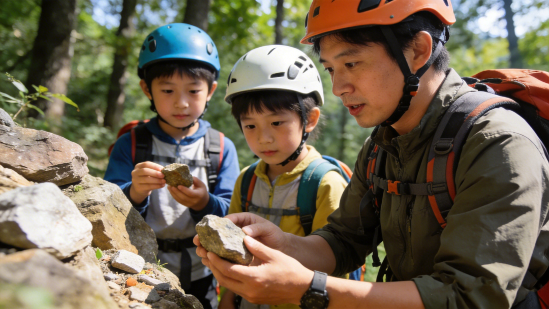 嵩阳山的岩石,藏着亿万年的故事。孩子们化身“小小地质学家”,蹲在岩壁前,用放大镜观察岩石的纹理、颜色、颗粒结构。研学导师讲解不同岩层的形成过程,孩子们一边听,一边在手册上记录发现。