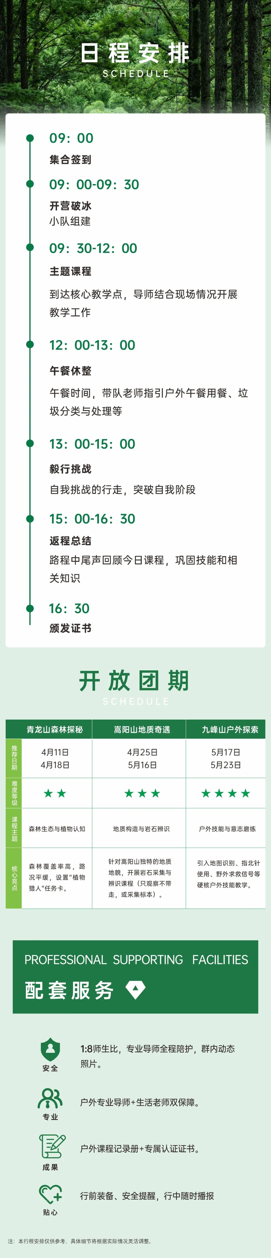你想给孩子一个怎样的周末?是一次简单的走走看看,还是3次山野挑战——从平缓的青龙山,到奇特的嵩阳山,再到硬核的九峰山,难度循序渐进,每参加一次,都有不一样的收获?