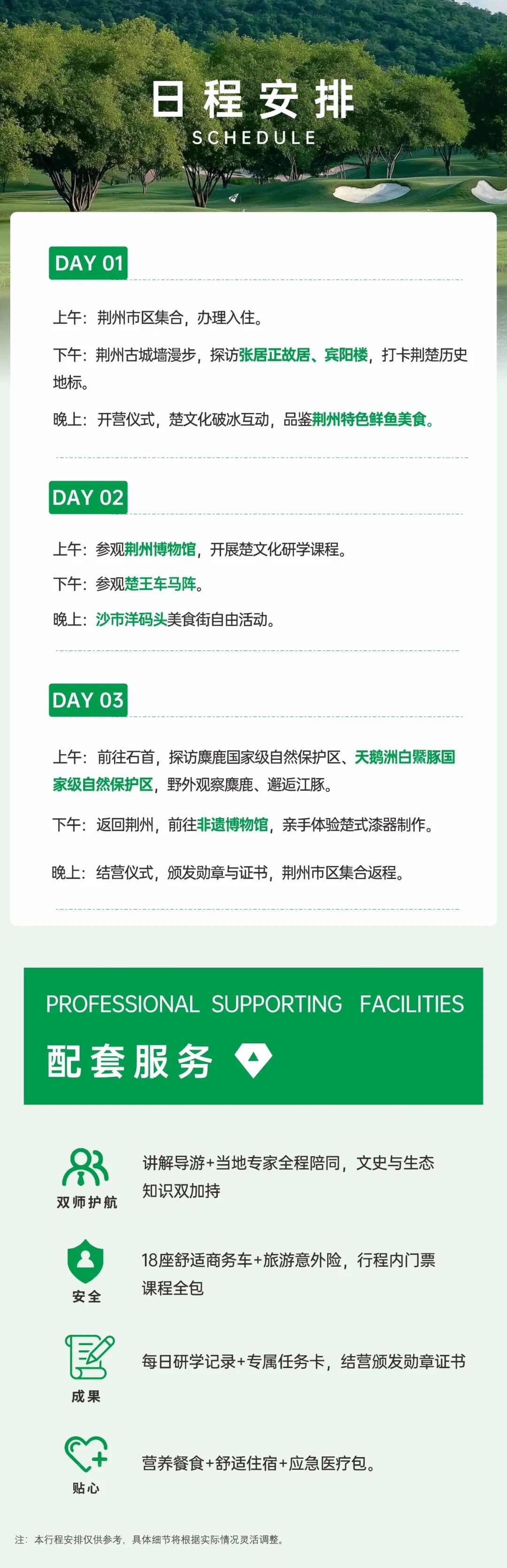 全程使用武汉出发的旅游资质空调大巴,含专业司机及高速油费。我们负责从武汉到荆州的无缝衔接,家长无需操心交通问题,真正做到“躺平”。
