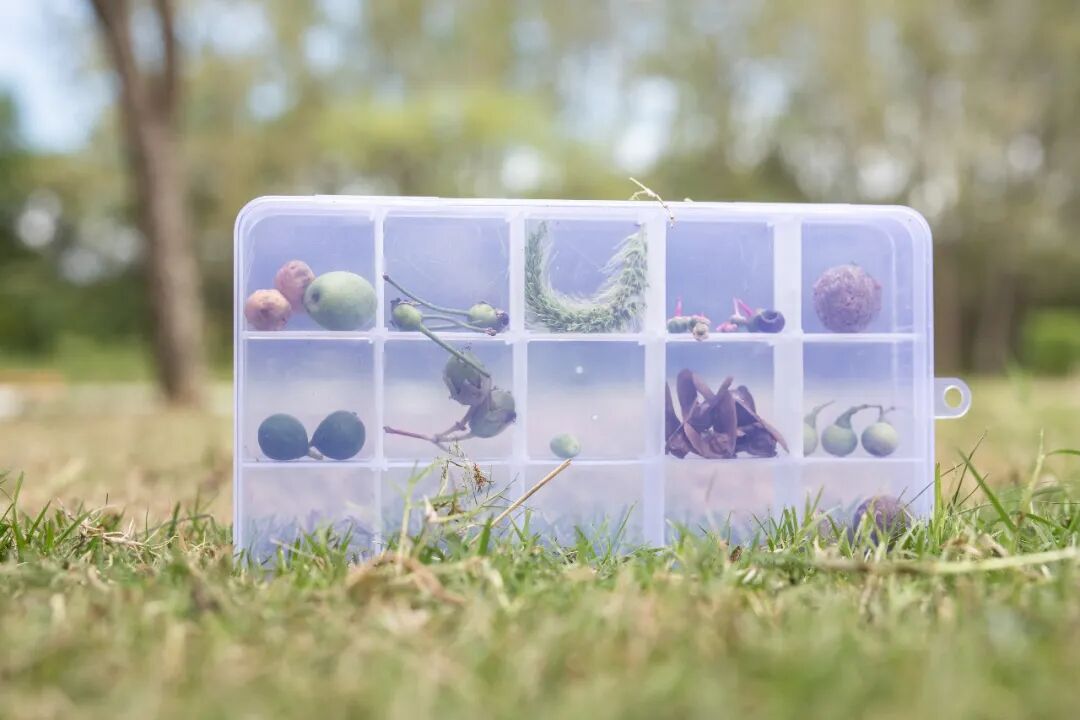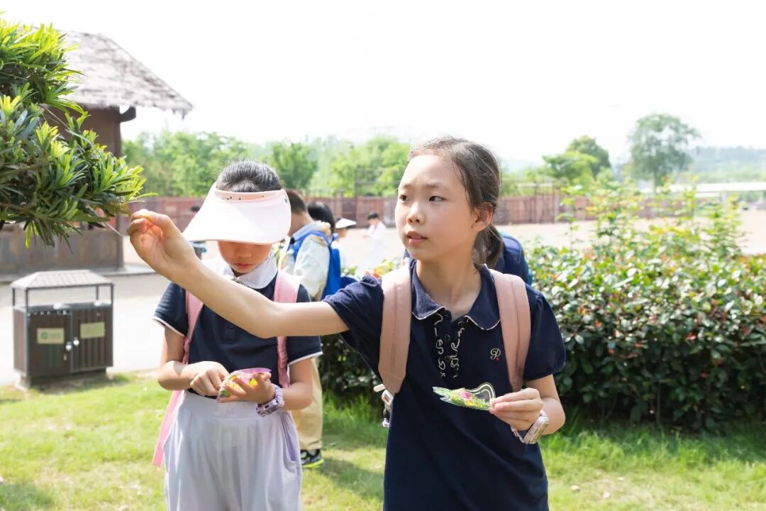 另一边,“标本专家”小分队拿着观察盒,在林子里找6到8种不同的植物,有的叶子带锯齿,有的背面毛茸茸,最后制作成植物标本。
