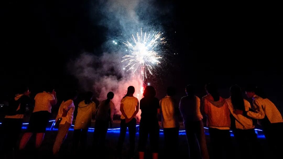 正说着,头顶突然炸开一簇烟花,定制的烟花秀持续5到10分钟,红的、金的、紫的,映着每一张仰起的小脸。