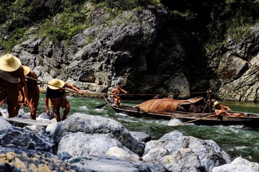 我们将乘坐小船进入「纤夫文化走廊」,亲眼看见真正的拉纤展示。人们赤脚踩在岩石边,一边拉纤一边喊着号子,孩子们坐在船上,就能近距离看到这一切。