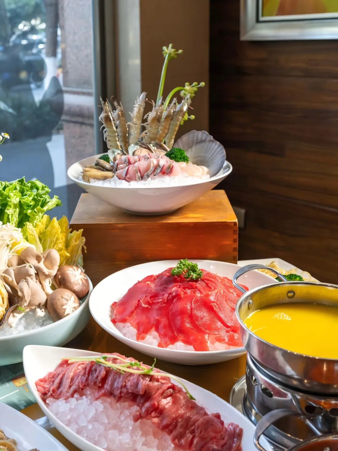 乳山生蚝个头像拳头,壳一掰开,那股海潮的鲜味直冲鼻尖;现切鱼生薄得能透光,落进汤里,轻轻一涮便化开;Q弹鲜虾,一个个整整齐齐躺在冰盘里,亮着壳,像在说:来,选我。