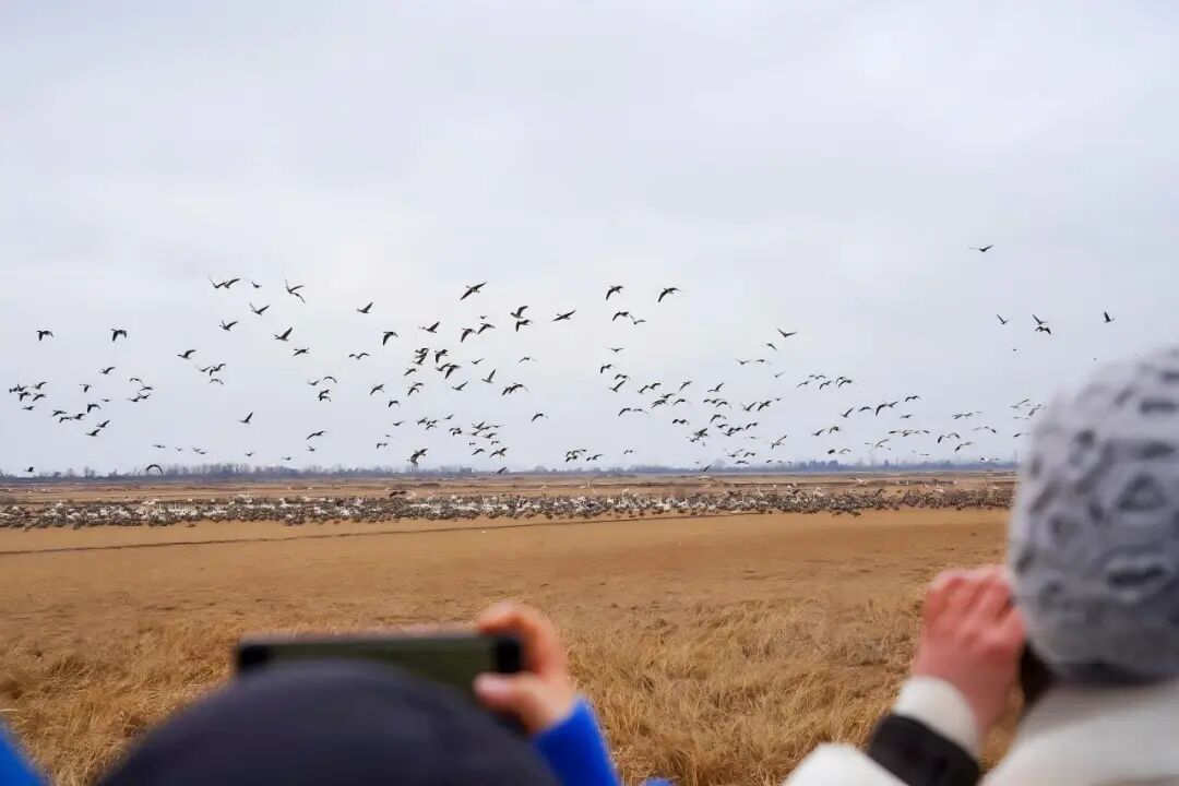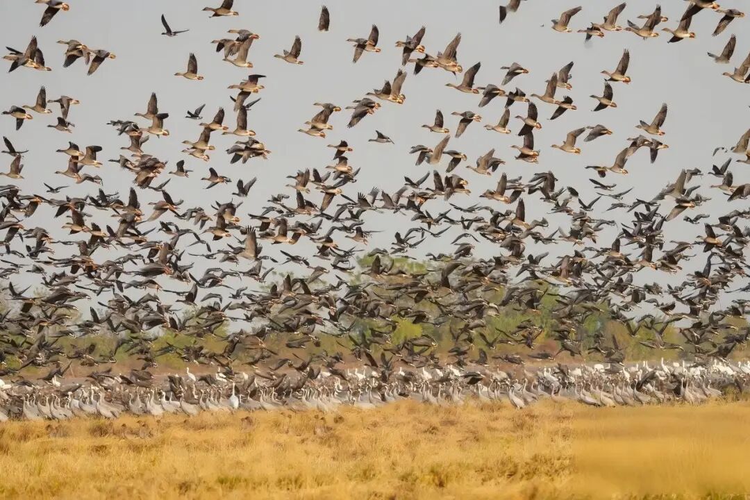 成群的白鹤、灰鹤、白枕鹤,从水面同时起飞,羽翼带起风声,整个湖面都在“动”。
